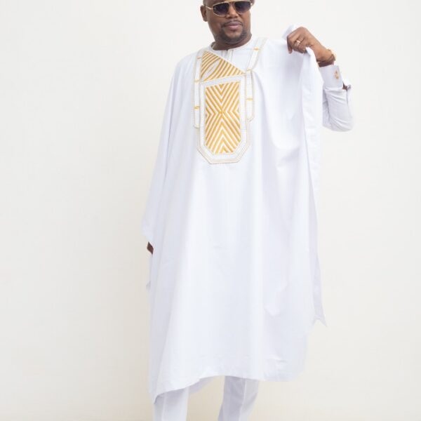Fabrication artisanale de haute précision;Parfait pour les grandes cérémonies, les événements de prestige ou tout moment où votre présence doit parler avant vous. Parce qu’un homme ne porte pas un Agbada. Il porte sa Majesté.